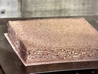 カラ松合板で自作した40~50cm四方の箱に、砕いた荒い木片と細かい木片を交互に手作業でなるべく均等に撒いて作る試作工程は、非常に繊細かつ重要な作業で、出来上がるとすぐに強度検査をし、1日に1試作ぐらいのペースなんだとか。